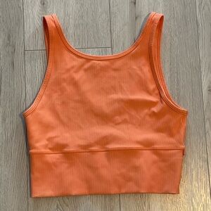 Lulu Lemon Athletics Power Pivot tank rib in Golden Apricot- a light peachy orange pink. Gorgeous cropped tank top in a thick, supportive ribbed fabric. Would also work as a longline Bralette/ light impact sports bra. Wear in with the v neckline in the front or with the high neckline.