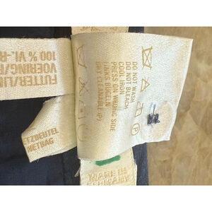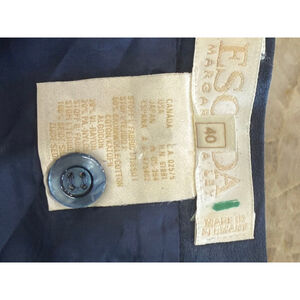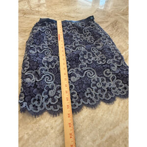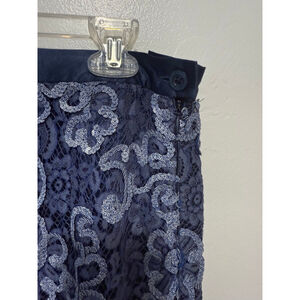 Escada women's pencil skirt, size 40 (EU), which corresponds to a US size 10. The skirt features a navy blue base with an overlay of light blue lace in a floral and scroll pattern. It has a satin-like waistband with a button and zipper closure on the left side. The hemline is scalloped with a delicate fringe. The fabric composition includes cotton, nylon, and silk. The skirt measures approximately 22 inches in length and 15.5 inches across the waist when laid flat. Care instructions indicate "Do Not Wash," "Do Not Bleach," "Cool Iron," and "Dry Clean (P)." The waste on this has two buttons that you could let out very easily if you needed another inch inch and a half 2 inches and that would not affect the zipper skirt is lined with a lovely soft satin fabric. Please see pictures for details, measurements and lovely used condition. No significant damage noted may be a string here or there, but that’s about it. I am accepting reasonable offers.