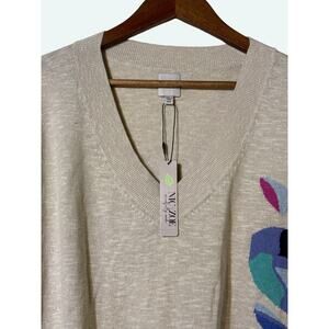NIC + ZOE 2X Floral Intarsia Sweater Beige V-Neck Cotton Blend Pullover NWT