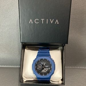 Experience precision with the Ativa Dual Time watch with lighted dial. Bold black and blue design. Ideal for everyday wear.