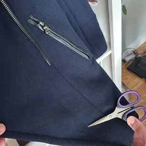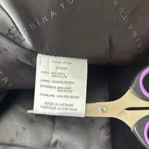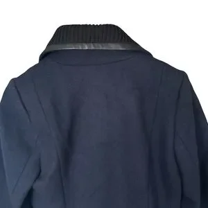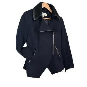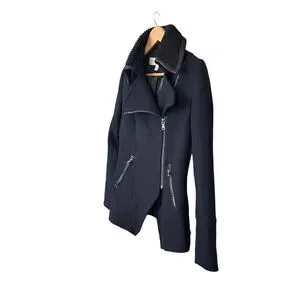 DESCRIPTION: Trina Turk Asymmetrical Zippered Front Fine Lambswool Blend Coat. Cozy Black rib-knit fabric lines the face-framing collar. Black Faux leather seaming details the collar and pockets. Feminine shaping and moto-inspired edge. Full length sleeves with zip detail. Front tulip hem and slip pockets that zipper. Fully lined.