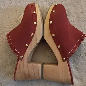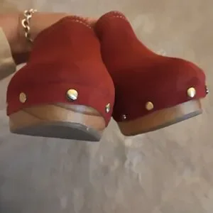 Features real wood soles, suede upper, leather lining, & authentic gold tone metal stud detailing.