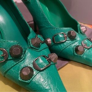 These are the “I’m not here to blend in” shoes. Vivid green Agneau Arena leather, sharp pointed toe, and Balenciaga’s signature Cagole studs and buckles.