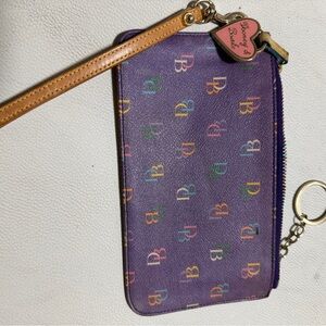 Colorful Dooney & Bourke wristlet with a purple base. Features a playful multicolor logo pattern. Includes a tan wrist strap and keychain.