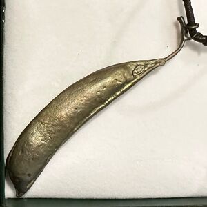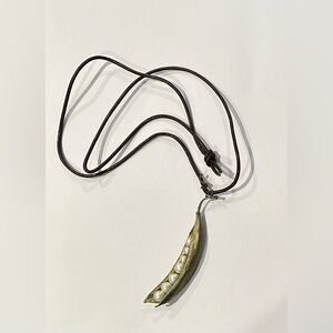 Bronze cast, hand patinaed Pea Pod necklace on a leather chain by artist Michael Michaud.