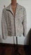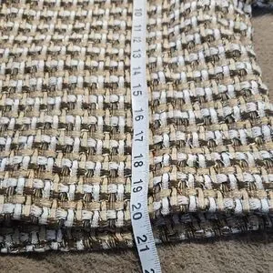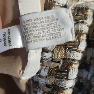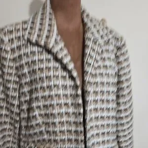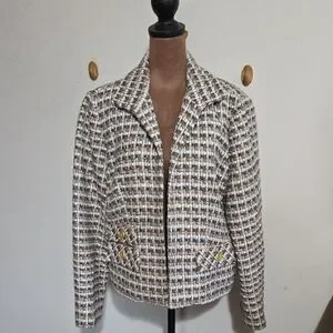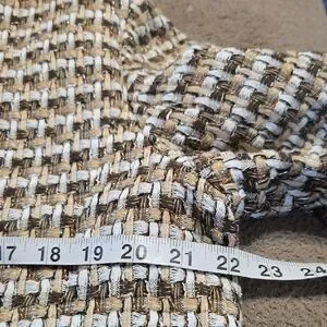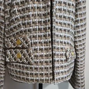 Cropped open front blazer completely lined with 3 faux front pockets. Brown tan and white with silver metallic thread.