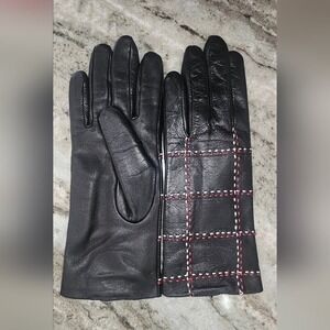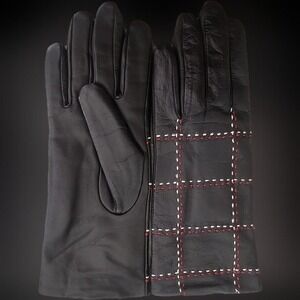 Soft black leather with red and white stitching detail on the top of the hand.