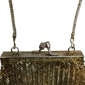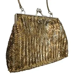 Vintage late-1950s hand-beaded evening bag featuring dense glass bugle beadwork arranged in a structured chevron pattern. Unlike lighter seed-bead styles, this bag has substantial weight and rigidity, paired with a solid metal frame and kiss-lock closure. Made in Hong Kong, consistent with higher-quality mid-century export beadwork. Petite evening size, often referred to as a cocktail bag.