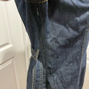 Pre-loved. Light denim material. Side zipper and two side pockets. Buttoned sleeves. Pit to pit is 18 in. Shoulder to hem is 35 in.