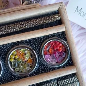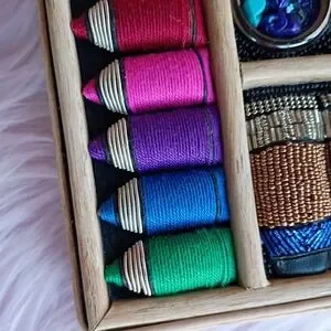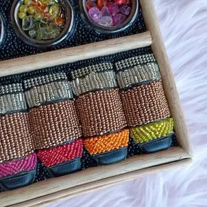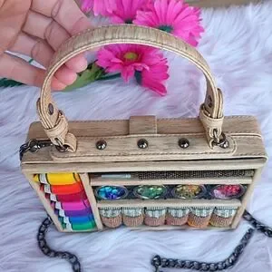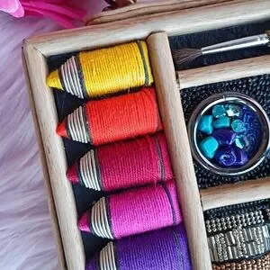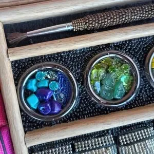 * A "wooden" box with crystal pots of pain, beaded colored pencils and embroidered thread crayons.... perfect for any artist or painter!