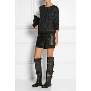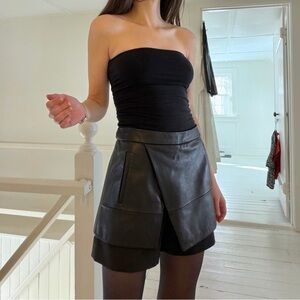 Tibi black, solid, midrise, leather mini wrap skort. Genuine lambskin leather overlay construction with contrasting attached virgin wool blend woven base-layer shorts. Fixed wrap design with asymmetrical front slit accent. Midwaisted, straight cut, mini length silhouette. Front welt pockets. Concealed center back zip closure. Size 6. Clipped for photos. Excellent condition.