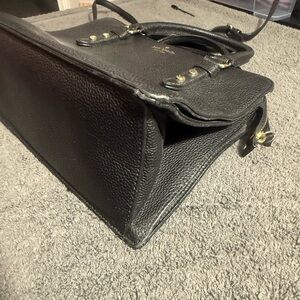 Chic black satchel with textured finish. Features dual handles and adjustable strap. Gold-tone hardware adds elegance.