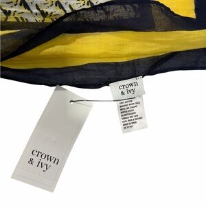 The Crown Ivy Woman Bee Print Scarf in navy blue, yellow, and white is a 72" x 29" semi-sheer scarf made from 100% cotton. It features an animal print pattern of bees, making it a unique and eye-catching accessory for women. With a colorful design perfect for the summer, fall, and spring seasons, this scarf from Crown & Ivy is a versatile piece that can be worn in various ways to add a stylish touch to any outfit. Made in India, this scarf is a fashionable and functional addition to any wardrobe.