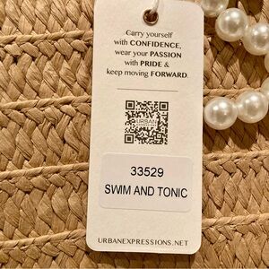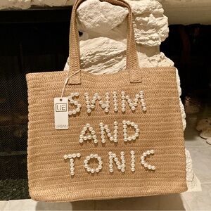 HARD TO FIND- NWT. Urban expression Seaton Pearl tote is a natural straw woven bag featuring a playful “SWIM AND TONIC” slogan made from faux pearls. Gold toned metal snaps, magnetic closure and zipper pull. Lined with tan cotton feel fabric and has inside zipper pocket as well as 2 slip pockets. Chanel your inner beach goddess with this breezy tote. Approximate dimensions: 17” wide, 14.5” top to bottom, 6” front to back and 9” double handle drop.