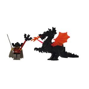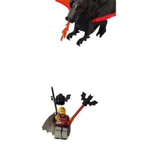 Vintage Lego Castle Fright Knights Basil the Bat Lord minifigure paired with a classic black dragon. This iconic duo features Basil with his signature bat-wing helmet, chrome silver sword, and bat-topped scepter. The dragon includes translucent red wings and a fire-breathing accessory piece. Perfect for collectors of 90s Lego sets, this pairing brings the Fright Knights theme to life with detailed printing on the torso and cape. All pieces are authentic Lego in great pre-owned condition.