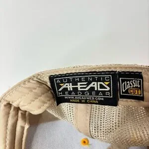 Ahead Headgear trucker hat commemorates the 123rd U.S. Open at LACC with a distinctive green and gold colorway. Classic Cut design features a structured green front panel with a frayed-edge embroidered pennant patch, a contrasting gold brim with multi-row stitching, and tan mesh back panels for breathability. Finished with a plastic snapback closure and a top button detail, this golf cap combines vintage-inspired aesthetics with modern comfort for fans of the championship.