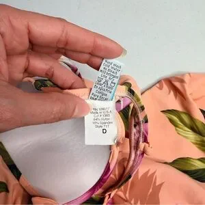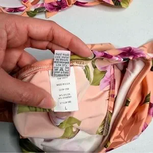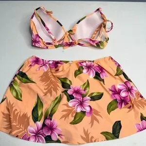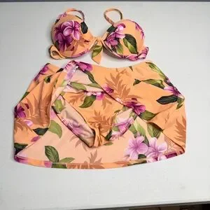 This vibrant bikini set features a stunning floral design in orange and pink hues. Perfect for a day at the beach or poolside lounging.