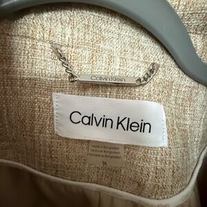 Stylish beige blazer by Calvin Klein. Perfect for professional and casual settings. Features a tailored fit. Fully lined. Color is a beige and tan mixed with white, see pics for up color detail. 25 in length, 23 in PTP, 25 in sleeves. Buttons all intact. In excellent condition with no call outs. Smoke free home. Pet friendly but stored away from pets.