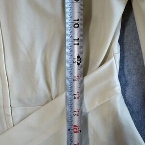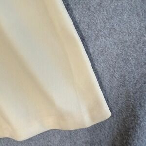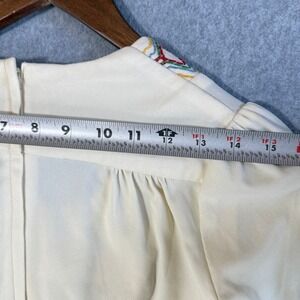 Vintage long-sleeve mini dress in an off-white cream hue features striking geometric embroidery along the square neckline and cuffs. Designed with a gathered bust, a defined inset waistband, and a back tie sash to customize the fit, this piece captures a classic 1970s aesthetic. The dress is finished with a rear zipper closure and slightly puffed shoulders for a structured yet feminine silhouette. Note that there are some faint spots on the lower skirt area as shown in the photos.