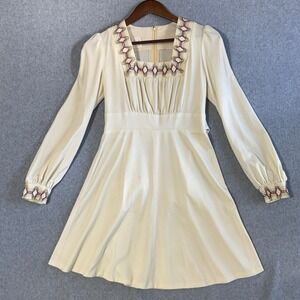 Vintage 70s Cream Embroidered Square Neck Mini Dress Long Sleeve Boho Style 5600