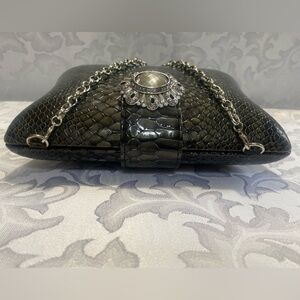 At one time, this bag retailed for $350 and is now retired. But what a gorgeous clutch/shoulder bag. The gray, glossy alligator print is perfect, no wear. The interior is spotless with that beautiful Brighton pattern. The silver chain is sparkly like new and tucks right inside if you prefer a clutch that night. The only wear I see is a little oxidation on the little alligator clasp hooking the chain in place. See pics. The jeweled clasp is a magnet, holding the bag shut. This is a heavy duty purse. For a clutch, there is nothing light about it. It’s hard casing will protect everything you carry inside.