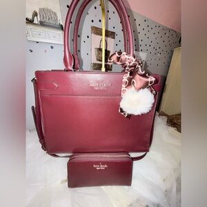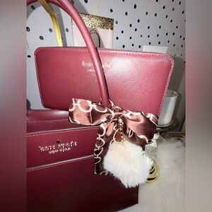 This 4FER includes a 1. Kate Spade bag with strap 2. Matching wallet 3. Bag puff and 4. Bag scarf. This stylish burgundy tote bag is perfect for any occasion and is made of strong leather. Its rich color adds a touch of sophistication to your outfit. Ideal for carrying all your essentials with ease. Perfect for work or school.