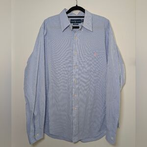 ralph lauren, vintage 90s, gingham, 16L, large tall, LT, blue white, pink pony, button down, long sleeve, cotton, preppy, ivy league, old money, coastal, business casual, classic fit, heritage, equestrian, tall mens, grandpacore, oxford, workwear, effortless, aesthetic