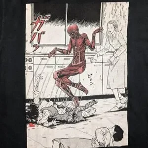 A human-ish figure sheds its skin in a classic manga-inspired scene on this Junji Ito T-shirt. Paying homage to the classic Japanese comic-style art, it's presented in black and white with red for emphasis, and includes Japanese kanji that add authenticity to its look and feel. This tee is black, with short sleeves and a crew neck that offer a classic fit.