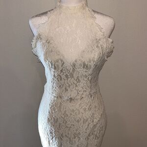 High neck halter with low cut back. Front center slit with mermaid train. Fully lined. Worn once for a few hours for an elopement ceremony. Stunning in person!