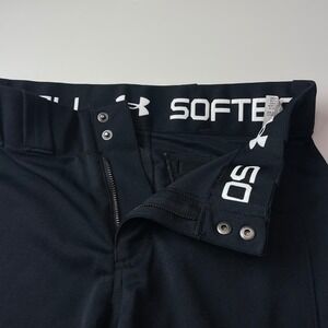 Under Armour softball pants crafted from durable 100% polyester fabric designed for performance on the field. These athletic pants feature a double-snap closure with a zippered fly, wide belt loops, and a comfortable elastic waistband branded with "SOFTBALL" on the interior. The classic black design is accented with a white heat-seal logo on the left hip and elastic cuffs for a secure fit during play.