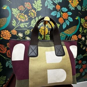 Authentic Bally Boothbay canvas tote featuring bold oversized “B” graphic and heritage detailing.