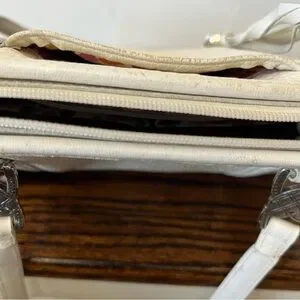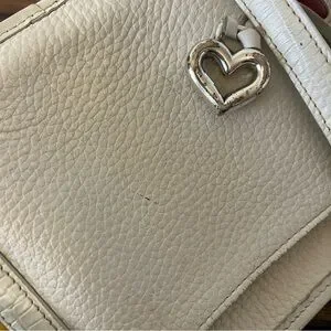 Brighton Fresca Multicolor Hearts Leather Shoulder Bag. It does have wear and tear but overall it’s in good condition. Some cracking of the leather on the straps. Some wear from rubbing on the edges and seams. There is also some wear on the silver heart charm in the outside. The interior looks really good.