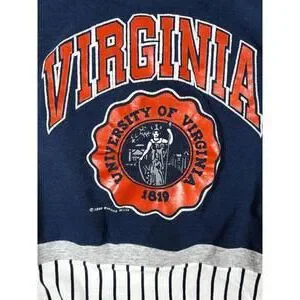 Vintage University of Virginia Nutmeg Mills sweatshirt featuring navy blue color with white striped accents on sleeves and bottom hem. Made of 50% cotton and 50% polyester for comfort and durability. Classic collegiate style with bold orange and white lettering and emblem on front. Perfect for casual wear or showing school spirit.