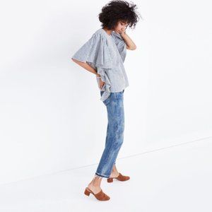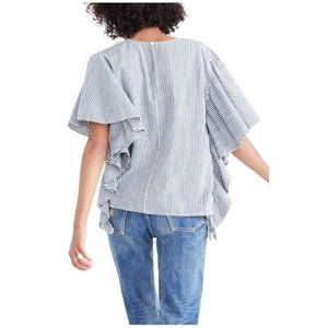 Madewell indigo stripe blue and white short butterfly sleeve blouse. Boxy, relaxed fit. Single button closure at the back of the neck. 100% cotton.