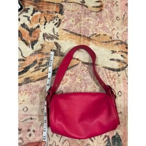 Vibrant hot pink shoulder bag features a unique cylindrical barrel silhouette with oversized silver-tone buckle hardware on the sides. Crafted from smooth vegan leather, this statement piece includes a wide, comfortable shoulder strap and a secure top zipper closure. The bold color and Y2K-inspired design make it a perfect accessory for adding a pop of color to any outfit.