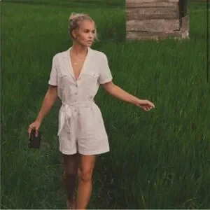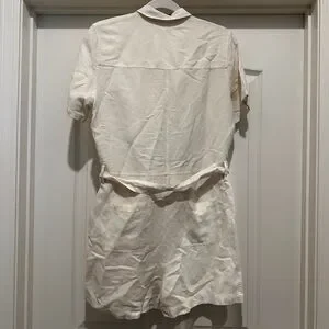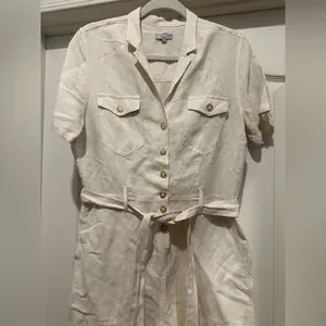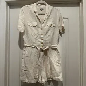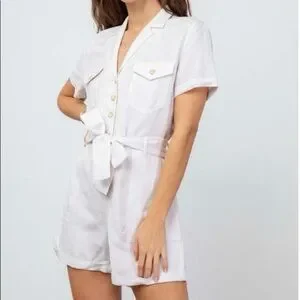 Utilitarian linen romper with a crisp notched lapel and an easy fit.