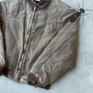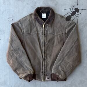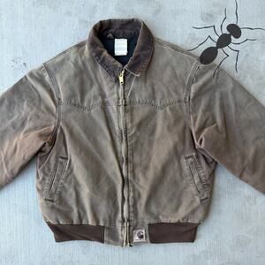 Carhartt J14 CHT brown Santa Fe work wear jacket. Nice little fade to this one! Few small stains on sleeves. Measures 25x27. Please check measurements before purchasing. I do my best to show any flaws in pictures. Quick shipping! Bundles encouraged!