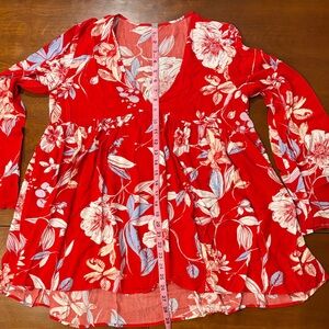 This Free People Bella tunic blouse is a must-have for any fashion-forward woman. The stunning red floral print and V-neckline make it perfect for any casual occasion. The pullover closure and long bell sleeves add a touch of elegance to this oversized tunic, which is made from 100% rayon and is perfect for all seasons.