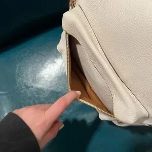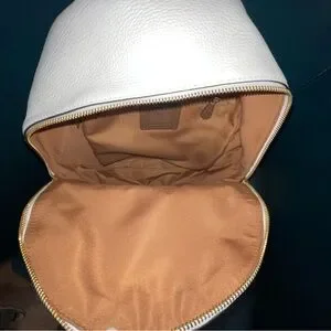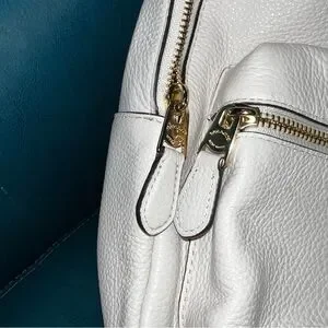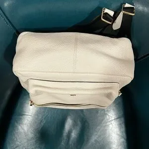 Refined pebble leather Inside zip pocket Zip closure, fabric lining Top handle with 2" drop Outside zip pocket Adjustable shoulder straps 10 3/4" (L) x 12 1/2" (H) x 4" (W).