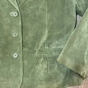 Vintage olive green suede leather blazer by Pursuits, Ltd. Features a soft genuine leather suede shell with a smooth satin-style polyester lining. Tailored single-breasted silhouette with three-button closure and front pockets. Beautiful earthy green tone with natural suede texture throughout.