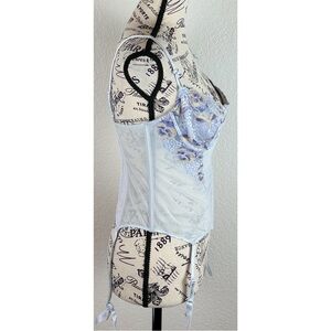 Beautiful floral bustier corset with intricate lace details. Features a delicate blue and white color scheme.