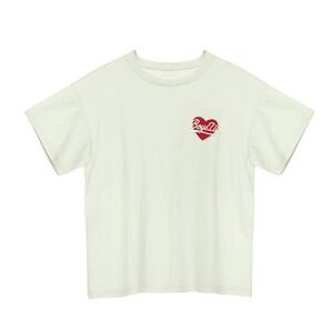 Signature Boyfriend Tee from Boys Lie in the Talc colorway. Crafted from 100% cotton, this oversized short-sleeve shirt features a distinctive red embroidered "Boys Lie" heart patch on the front chest and a small white cherub logo embroidered on the back neck. The slub jersey texture gives it a relaxed, lived-in feel, making it a versatile staple for casual streetwear styling.