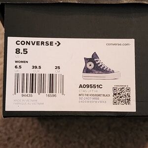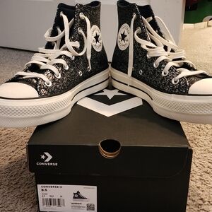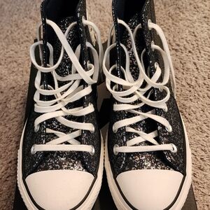 Platform Converse sneakers with a glittery black and silver design. Features classic white laces and sole. Iconic logo on the side.
