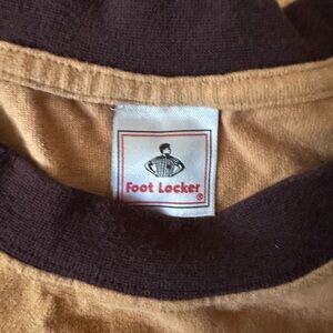 Add a touch of retro athletic style to your wardrobe with this vintage Foot Locker long sleeve tee. This comfortable shirt features a unique tan body accented by a contrasting dark brown ringer neck and racing stripes down the sleeves with white piping. Made from soft, 100% cotton, it offers a relaxed, oversized fit that is perfect for a "skater" or 90s streetwear aesthetic.