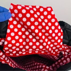 Stylish black quilted tote bag featuring a charming red polka dot bow design. Perfect for adding a playful touch to any outfit.