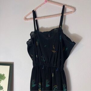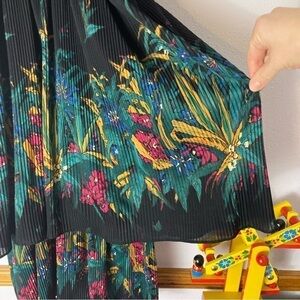 Tags- VTG 60s 70s style Stevie nicks style wispy breathable summer spring palm frond orchid dark black layered pleated goldenrod yellow teal leaves flowers pink blue bird of paradise petal