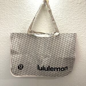 This authentic Lululemon shopping tote features a neutral beige geometric pattern with bold black logo branding on the exterior and interior. Made from durable woven polypropylene, this eco-friendly bag is lightweight yet sturdy—perfect for gym gear, yoga classes, travel, groceries, or everyday errands.
