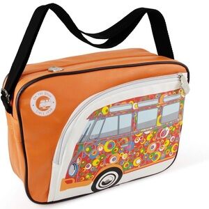Vibrant messenger bag with a colorful van print. Features an adjustable black strap and orange accents.