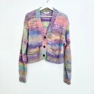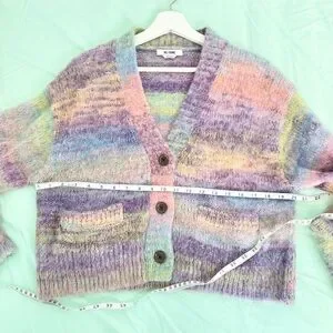 Small RE/DONE ’90s Cropped Oversized Rainbow Cardigan. This is a fluffy mohair blend that looks and feels like cotton candy.