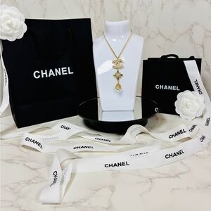 Luxurious faux pearls w/a monogram encrusted rhinestone cross pendant on an exquisite golden necklace. Ideal for elevating any ensemble.
